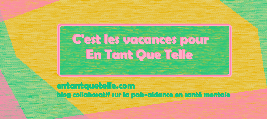 C’est les vacances pour En Tant Que Telle, blog collaboratif sur la pair aidance en santé mentale Ici: – un suivi des annonces faites au printemps dernier – le partage de nouveaux défis – l’évolution des contributions et des visites du blog NOUVEAUX DEFIS ET SUIVI DES ANNONCES DE MARS Nouveaux défis: Continuer l'organisation des …